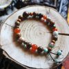 MYTHOS kollekciónkban egy-egy női mitológiai szereplő erejét próbáltuk az ásványok segítségével ékszerekbe átütetni – reméljük, hogy Te is megtalálod köztük azt, aki nagy tettekre inspirál a mindennapokban! Az Odudua istennő által ihletett ásványkarkötő 6 és 8mm-es ásványkülönlegességek (elefántbőr jáspis, kígyóbőr jáspis) és karneol kombinációjából készült, réz színű, nikkelmentes kiegészítőkkel és fa gyöngyökkel. A karkötő mérete kb 19 cm, textilborítású gumialapra készült, amely tartósabb, mint a gumiszál. Egyedi darab, korlátozott mennyiségben rendelhető.
